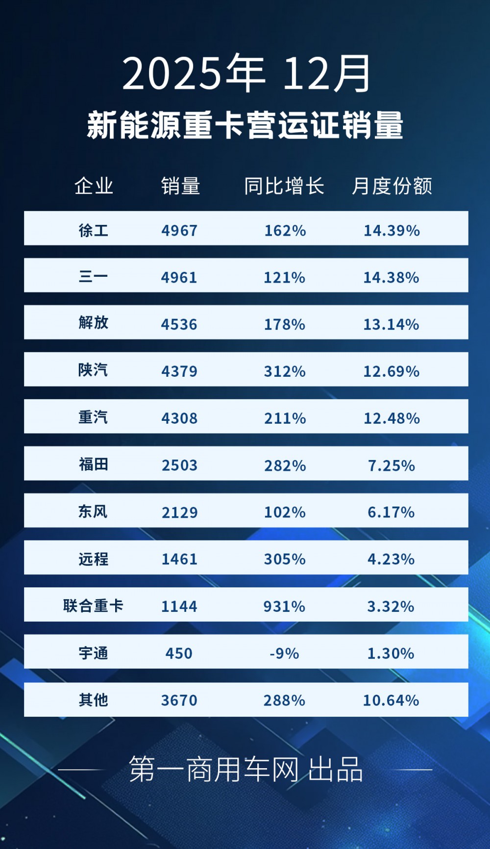 根據(jù)重型貨車營運證新增統(tǒng)計,2025年12月份,有12家企業(yè)新能源重卡銷量超百輛,其中有10家企業(yè)銷量超過400輛,月銷量破千的企業(yè)達到9家(較上月增加2家)。排名前5位的企業(yè)銷量均超過4000輛,徐工斬獲月榜銷冠,銷量達到4967輛;排名月榜第2-5位的三一、解放、陜汽和重汽銷量分別達到4961輛、4536輛、4379輛和4308輛;排名月榜第6、7位的福田和東風(fēng)銷量雙雙超過2000輛,分別達到2503輛和2129輛;遠程和聯(lián)合重卡排名月榜第8、9位,分別銷售1461輛和1144輛;宇通銷售450輛排名月榜第10位。