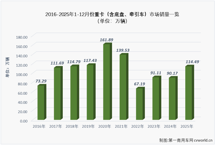 至此,2025年中國重卡市場全年銷量最終定格在114.5萬輛,同比2024年的90.2萬輛凈增長超過24萬輛。